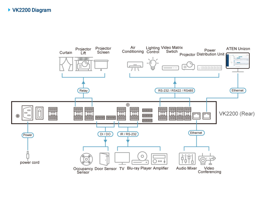 A VK2200, az ATEN második generációs Control Box-ja a sorozat legnagyobb teljesítményű processzorával büszkélkedhet. A négymagos CPU-val és 2 GB / 1 GB memóriával felszerelt VK2200 valós idejű válasz- és állapotfrissítéseket biztosít, és képes feldolgozni az összetett eseményeket testreszabott grafikus felülettel, valamint többfelhasználós hozzáférés-vezérléssel a csatlakoztatott eszközökhöz. A VK2200 kettős, elszigetelt LAN-porttal rendelkezik – a LAN és a Control LAN. A Control LAN lehetővé teszi a felügyelt eszközök biztonságos védelmét külön hálózaton belül, a vállalati hálózattól függetlenül, a magas biztonsági és stabilitási igények kielégítése érdekében. Másrészt, a LAN csatlakoztatható az ATEN Unizonhoz, egy központi platformhoz, amely leegyszerűsíti a napi AV/IT menedzsmentet, és amely biztosítja a felhasználók számára, hogy egyszerre több rendszert is felügyeljenek, végezzenek és karbantartsanak.